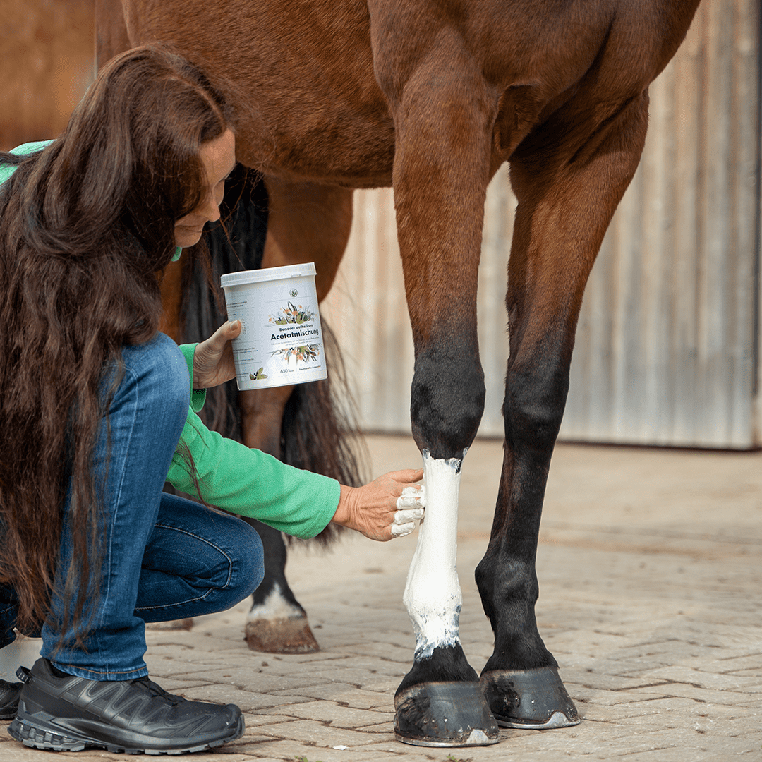 Benacet aethericum Acetatmischung zu gleichen Gewichtsanteilen mit Wasser zu einer Paste anrühren (650 g / 2,5 kg Pulver mit 650 ml / 2,5 I Wasser). Die Paste großzügig im Bereich der betroffenen Körperteile auf die Haut aufstreichen.