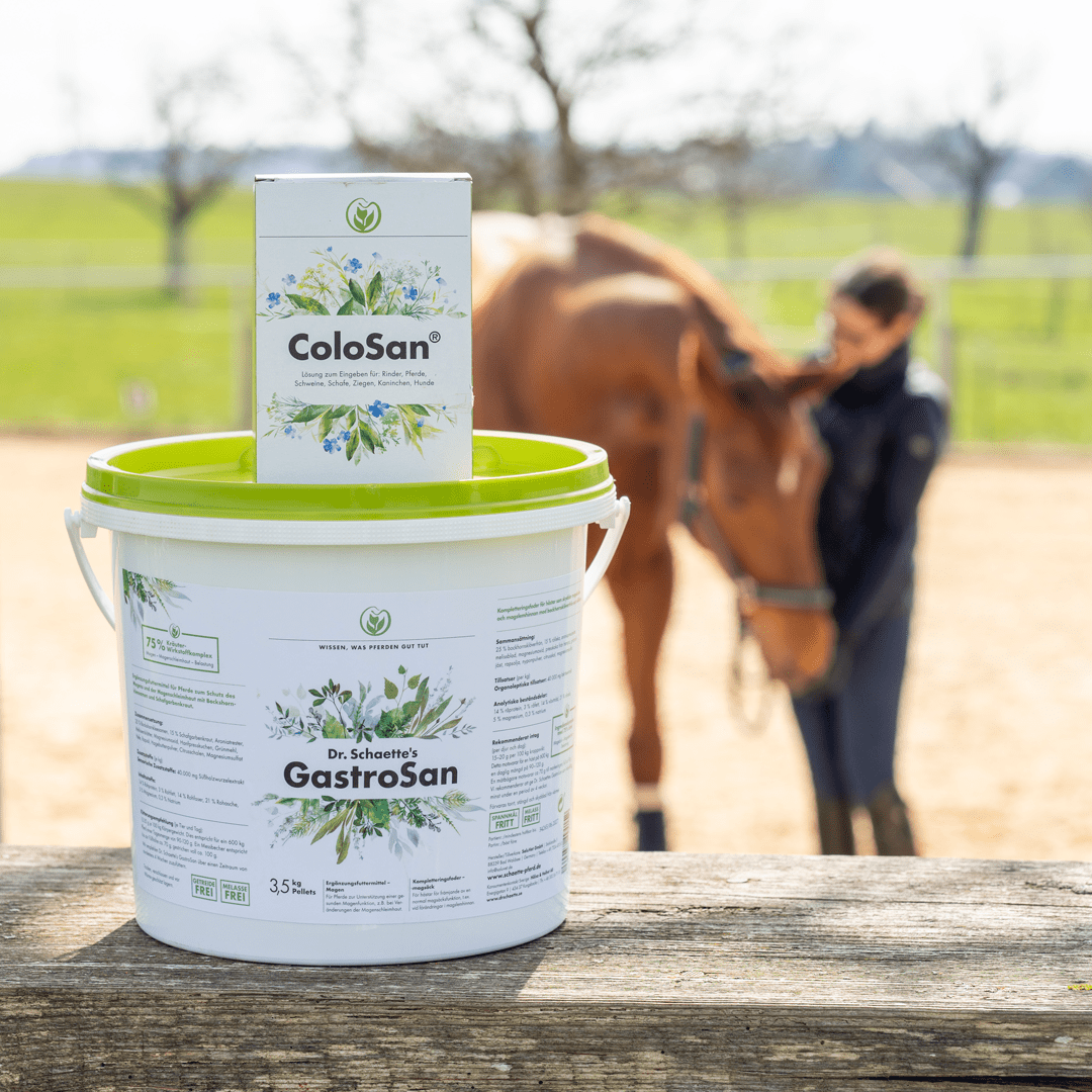Das Magen-Bundle kombiniert das bewährte Tierarzneimittel ColoSan® mit dem Ergänzungsfuttermittel Dr. Schaette’s GastroSan. Es liefert wertvolle Pflanzenstoffe wie Sternanis, Zimt, Bockhornklee und Süßholzwurzel.